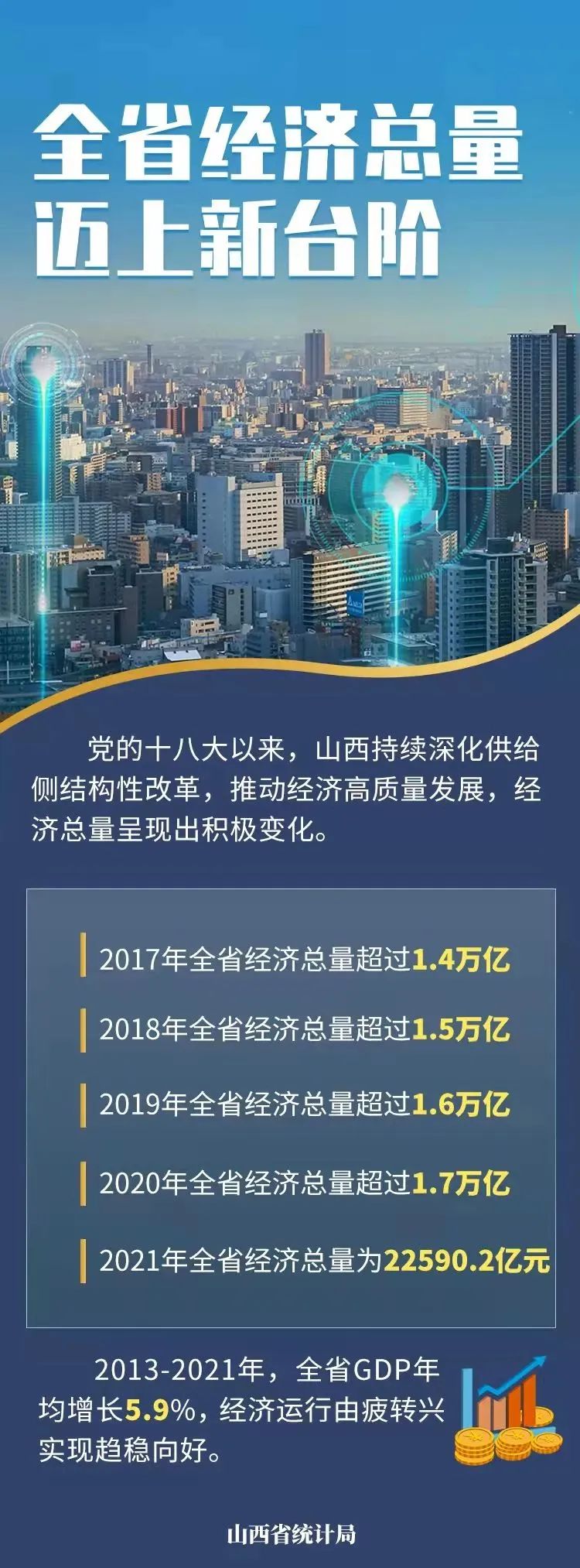 自2021年起,山西省经济总量迈上新台阶。2021年,全省地区生产总值实现22590.2亿元,2022年上半年为11568.9亿元。2022年上半年全省GDP增长5.2%,快于全国(2.5%)2.7个百分点,排全国第2位。